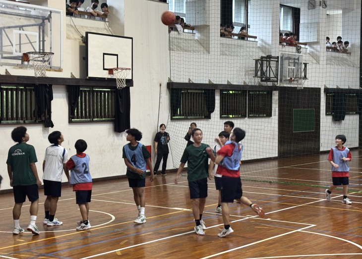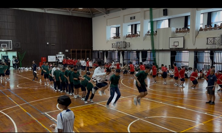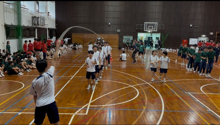 雨天でありましたが、体育館ではバレー、バスケ、多目的広場では、「玉入れ」「だるまさんが転んだ」をユニークな新ルールも加え兄弟学級で競い合いました。4種競技の後は、全校生徒が体育館に集まり「大縄跳び」を行い、飛んだ回数の合計で兄弟学級ごとに息のあった「跳び」を見せてくれました。